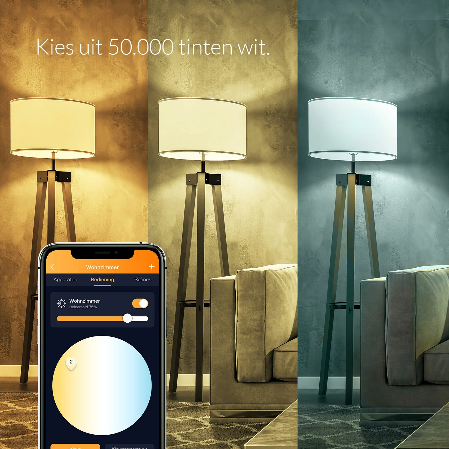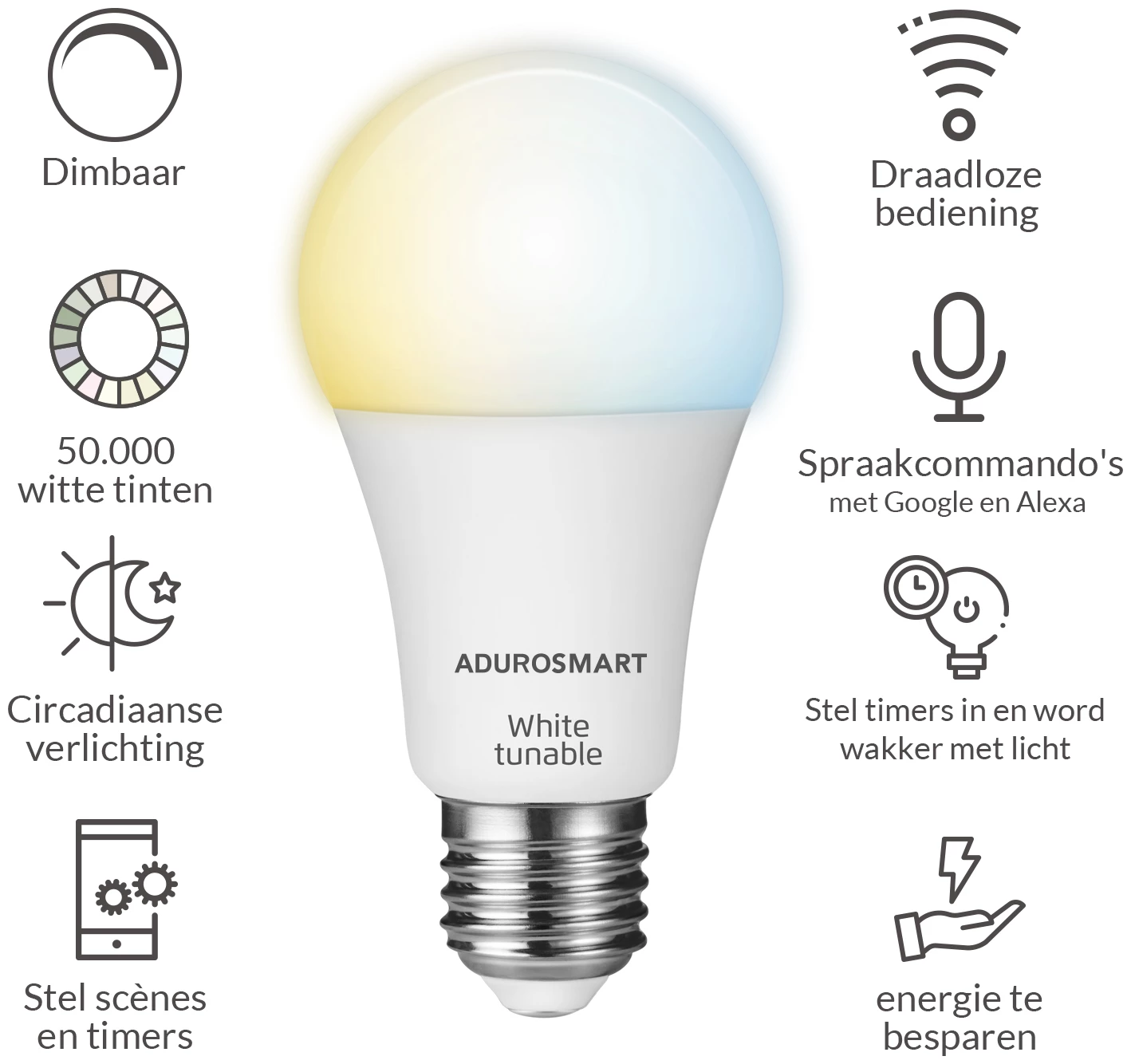 Afstembaar en dimbaar wit: Kies uit een reeks van warme en koude witte kleurtemperaturen (2700~6000K) en verander de helderheid om de sfeer in te stellen. Stel scènes en timers in om uw welzijn te verhogen en uw circadiane ritme te bevorderen door het simuleren van natuurlijk licht in huis. AduroSmart afstembare witte lampen kunnen zonlicht weergeven van zonsopgang tot zonsondergang.