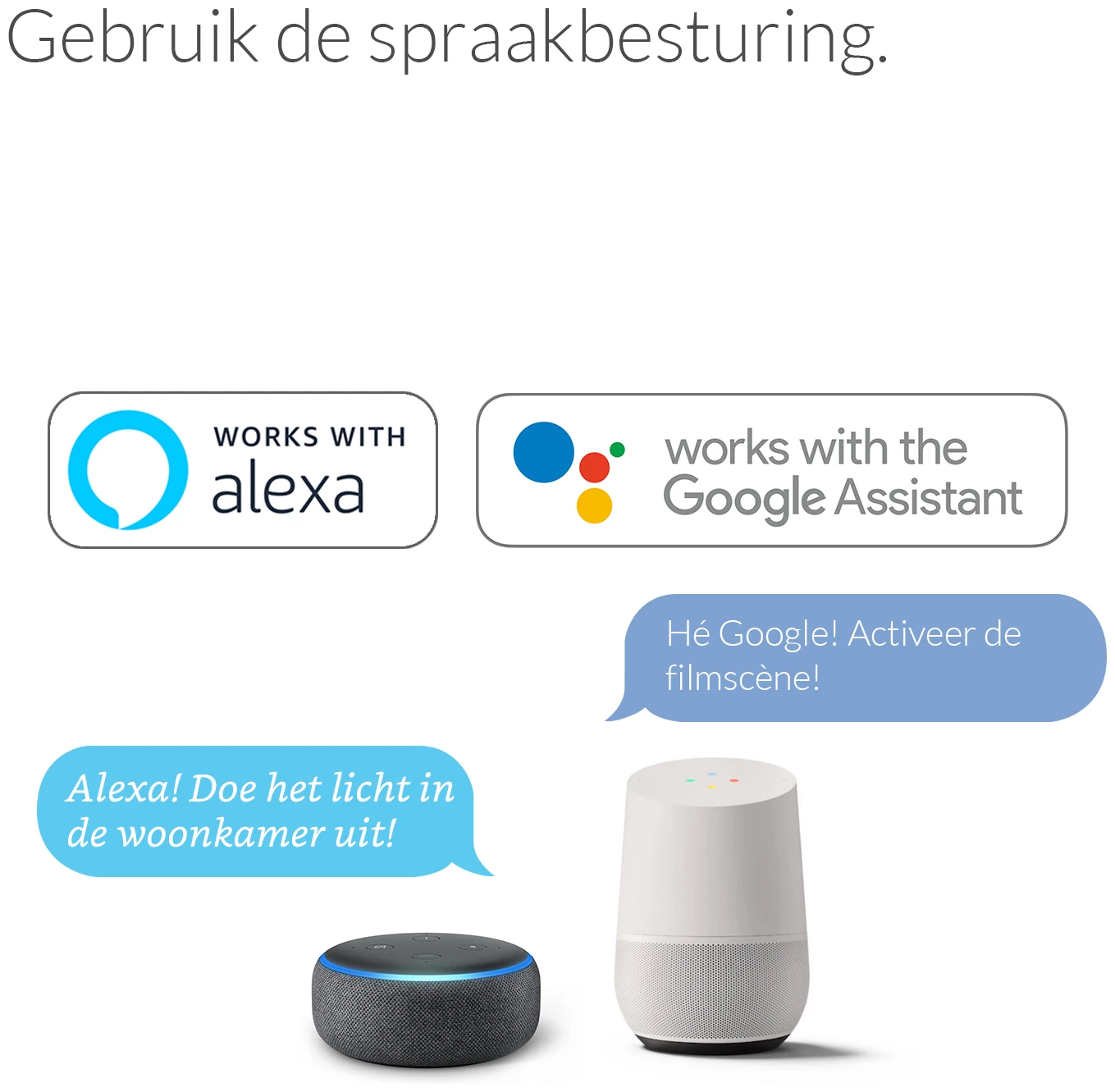 Spraakgestuurd: Werkt met Amazon Alexa en Google Home in combinatie met een Hue of AduroSmart bridge (apart verkrijgbaar). Kan direct worden aangesloten op de Amazon Echo Plus. Voor de Amazon Echo Dot, Echo, Echo Show en Echo Spot is een brug nodig zoals AduroSmart, HUE of SmartThings om de lampen te bedienen met Alexa of de Alexa app.