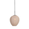 Deze uitvoering wordt geleverd met een lichtdoorlatend linnen kapje in crèmekleur, in een elegante druppelvorm met een diameter van 25 cm en een hoogte van 25 cm. De kap verspreidt een zacht, sfeervol licht dat perfect past boven een eettafel, een kookeiland of een keukenbar.