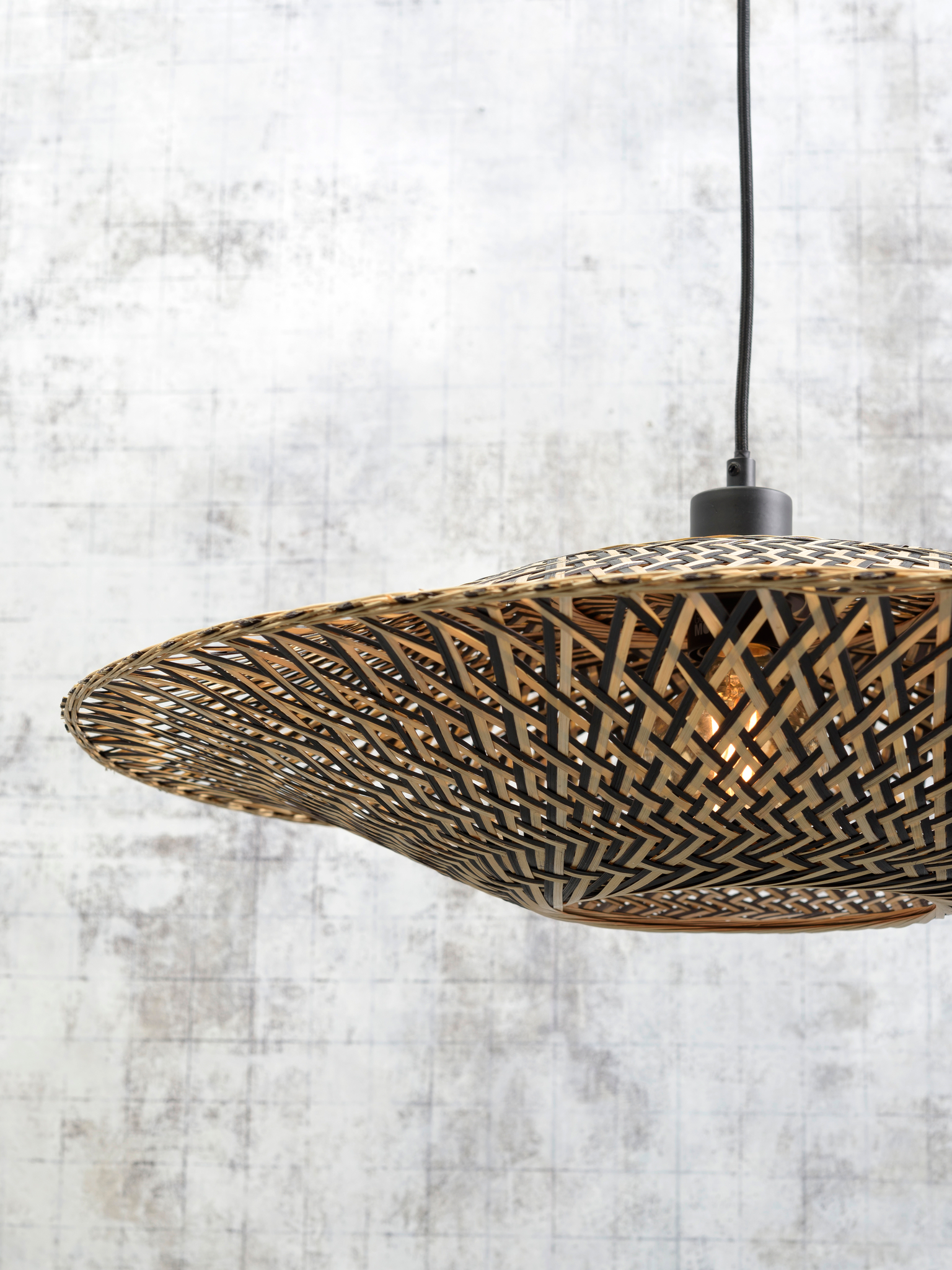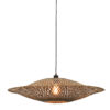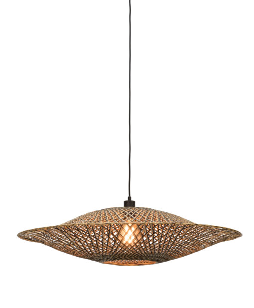 Vernoemd naar het paradijselijke Indonesische eiland dat bekend staat om zijn spirituele cultuur en prachtige bezienswaardigheden, zal deze Bali hanglamp van bamboe, met grote kap afmetingen van 87 cm diameter en 20 cm dikte, een vleugje idyllische charme in je interieur brengen. De sterke, lichte lampenkap van fijn hand geweven bamboe verspreidt een warme gloed door de kamer en schept zo een exotische maar toch natuurlijke en huiselijke sfeer. De afwisselend zwarte en natuurlijke tinten van de hand geweven bamboe stroken in de lampenkap accentueren de moderne uitstraling van je interieur en zorgen voor levendigheid. De hanglamp zal een ideale decoratieve item zijn op zichzelf of in harmonieuze combinatie met andere lampen uit de serie Bali.