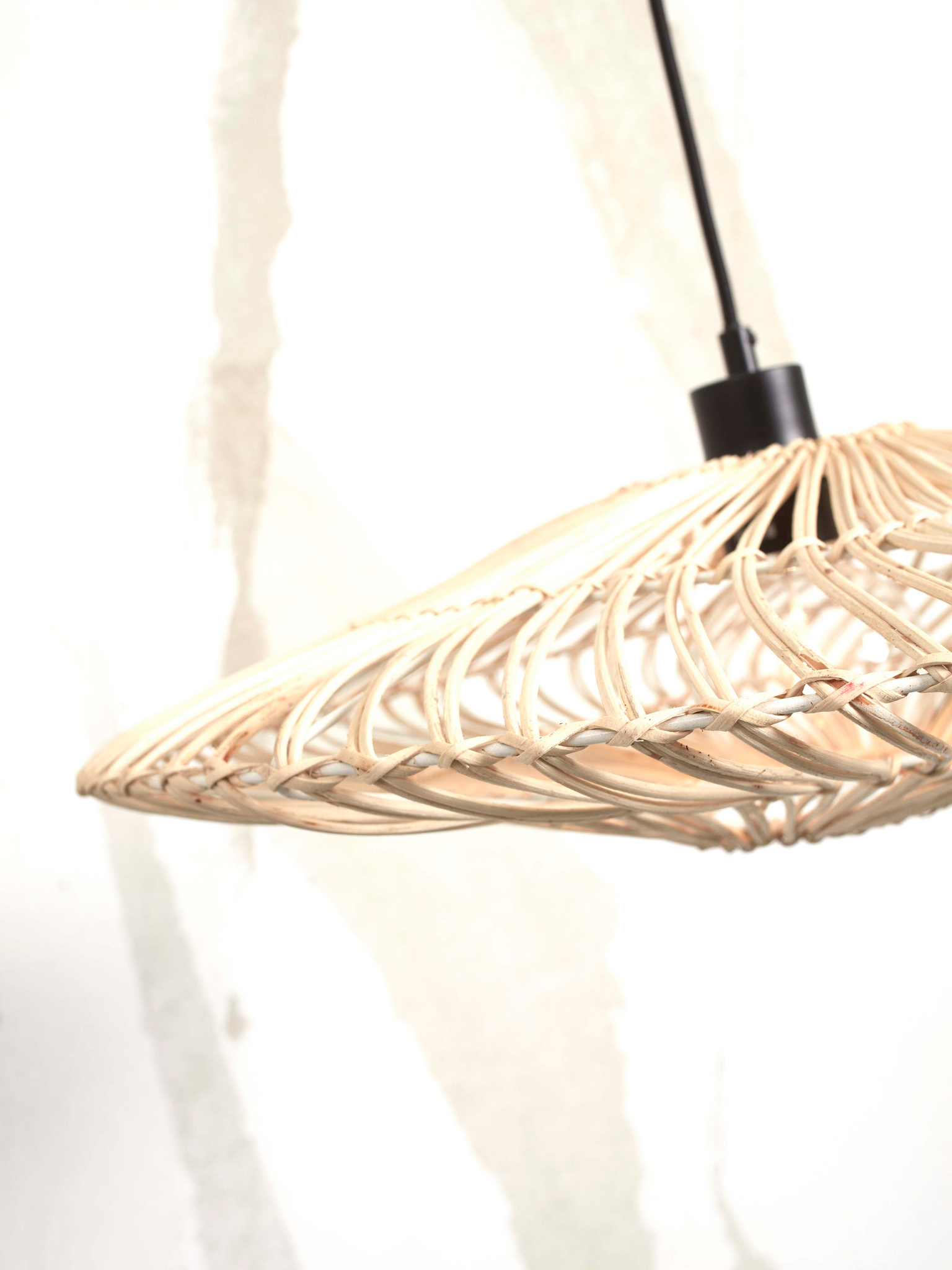 De hanglamp Zanzibar is een elegant, tijdloos en duurzaam product dat perfect past in ieder interieur. De platte lamp is gemaakt van duurzame rotan en is een echte eye-catcher in elke kamer. De Hanglamp Zanzibar is ontworpen met de nadruk op duurzaamheid en verantwoord consumeren. Het is gemaakt van natuurlijk wit geverfd rotan en is niet alleen functioneel, maar ook esthetisch verantwoord. De maat S, met een diameter van 55 cm, is een unieke toevoeging aan elke kamer en past bij een duurzame levensstijl. De naam Zanzibar brengt gelijk een gevoel van avontuur en ontdekken met zich mee. De prachtige tropische kust van Zanzibar is gevuld met witte stranden, eindeloze palmbomen, kleurrijke markten en een bruisend nachtleven. Hanglamp Zanzibar is een verlichting die het gevoel van de prachtige Zanzibar naar elke kamer brengt. Met deze lamp kun je even ontsnappen naar deze magische plek, zelfs als jethuis bent. Daarnaast planten ze voor elk verkochte lamp een boom.
