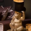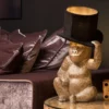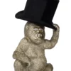 Hoedje af voor deze Gorilla tafellamp. Als een volleerde jonkheer brengt Extravaganza Gorilla met een vleugje humor binnen in je woonkamer, slaapkamer of bureau. Op een stijlvolle manier bovendien. De kunststoffen gorilla – zeg gerust Gust – reikt met zijn linkerhand omhoog om je goedendag te knikken met zijn hoed. Niet zomaar een hoed. Binnenin de hoed zit de lamp verscholen. De open top geeft het licht vrij spel naar boven, net zoals de ruimte tussen het hoofd van de gorilla en de hoed zelf de lichtstralen naar beneden verspreidt. Zet deze extravagante verlichting aan via de schakelaar op het snoer en vlij je gezellig neer. Gorilla Gust geeft alvast het goede voorbeeld.