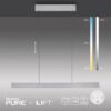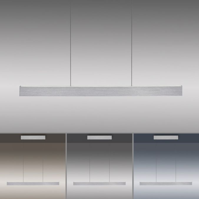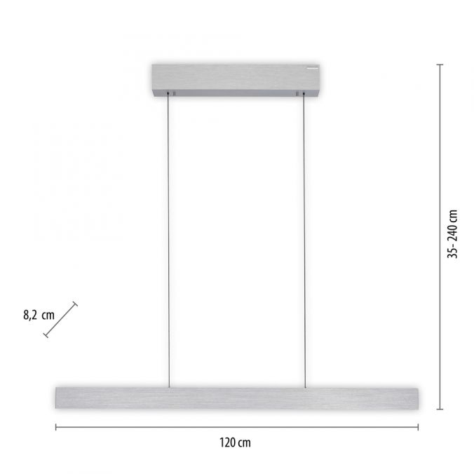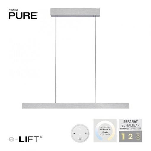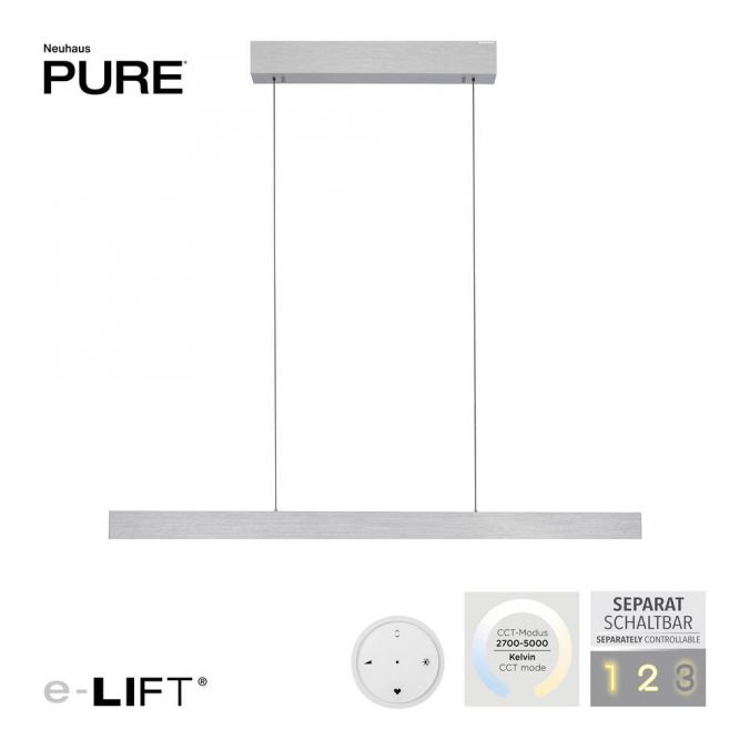 De Aluminimum Hanglamp van Pure met Motion Lift Techniek van Paul Neuhaus is een moderne en functionele verlichting voor elk interieur. Deze hanglamp heeft een strakke afmeting van 120 cm (L) x 8,2 cm (B) x 240 cm (H), wat hem perfect maakt voor boven een eettafel of in een grotere ruimte. De lamp wordt geleverd met een 39 watt LED-paneel, dat een krachtige lichtopbrengst van 1600 lumen biedt. Het licht is instelbaar van 2700K tot 5000K, waardoor u de sfeer kunt aanpassen aan uw wensen, van warm en gezellig tot koel en helder.