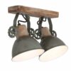Groene stoere 2-lichts plafond of wandspot model Gearwood . Deze industriële 2-lichts spot is draai/kantelbaar en verstelbaar middels grote verstel wielen en beschikt over een E27 fitting geschikt voor alle lichtbronnen tot 60 Watt. Dimbaar, middels een externe dimmer. Vervaardigd uit metaal en hout heeft een groene glimmende reflektor. Armatuur is voorzien van houten accenten. De diameter van de kap is 15 centimeter en de totale hoogte van het armatuur is 19 centimeter. Bestel deze plafondspot nu online met onze service en garantie.