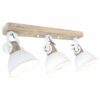 Deze stoere witte 3-lichts plafond- of wandspot komt uit de Gearwood Spot serie. Deze industriële witte 3-lichts spot is draaibaar en kantelbaar middels grote verstel wielen en beschikt over een E27 fitting geschikt voor alle lichtbronnen tot maximaal 40 Watt. De 3 lichts is dimbaar, middels niet meegeleverde externe dimmer en geschikte lichtbron. Vervaardigd uit metaal met houten accenten. Heeft een mat witte reflector. De diameter van de kap is 15 centimeter en de totale hoogte van het armatuur is 19 centimeter. Bestel de 2133W plafondspot nu online met de service en garantie van lampbestellen.nl