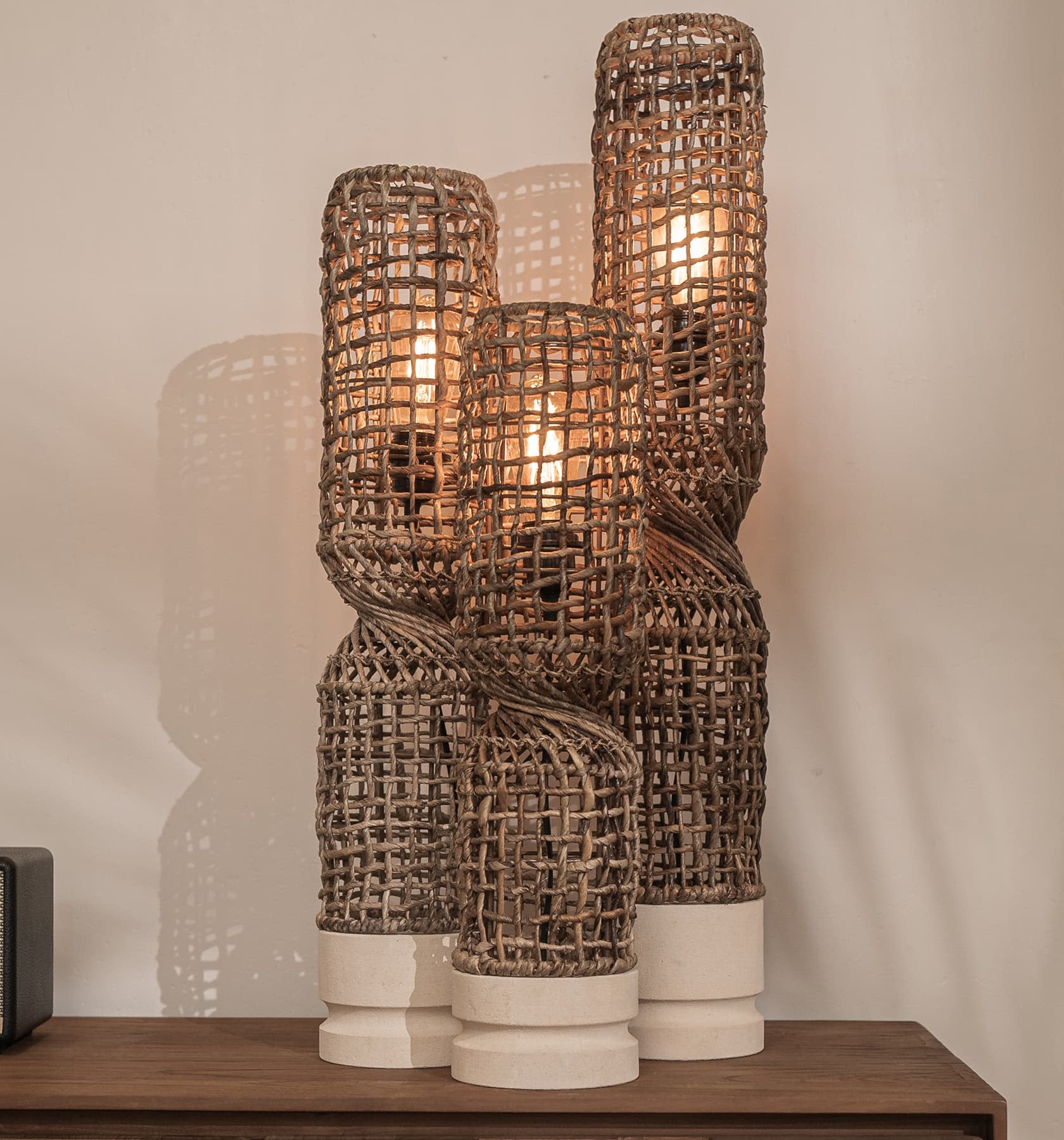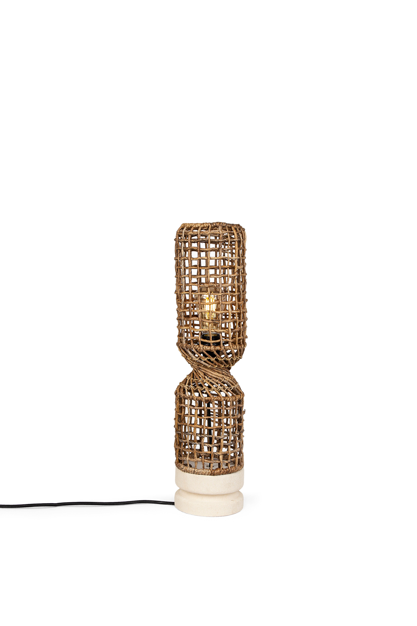 Beschikbaar in de maten S, M, L, zijn de Twister Tafellampenkappen vrijstaande tafellampen gemaakt in een ‘vistuig’ ontwerp met een metalen frame en meesterlijk omwikkeld met Abacabast om een rustieke en aangename geweven uitstraling te creëren. De lampen zijn vervolgens geknepen en gedraaid, wat stijlvolle “twist-details” onthult en rusten op een solide, met de hand gekeerde zandstenen basis, die zowel stabiliteit als veiligheid biedt. Schakel bediend en werpt een prachtige gevlekte gloed op oppervlakken en muren. De Twister Tafellampkapcollectie voegt prachtige details toe aan kamers van elke stijl. Type: 14 x 14 x 70 cm.