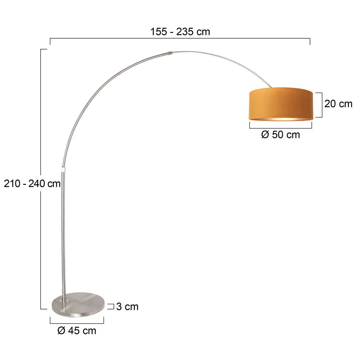 Grote Booglamp uit de Sparkled Light serie, wordt geleverd met gouden velours kap met een doorsnede van 50 centimeter en 20 centimeter hoog. Het armatuur is vervaardigd uit geborsteld staal en voorzien van een E27 fitting, geschikt voor alle type lichtbronnen tot 60 watt. Door de verschillende verstel mogelijkheden kunt u precies licht geven daar waar u het wilt. De maximale hoogte van de lamp is 230 centimeter. De maximale uitschuiflengte is 190 centimeter (zonder kap). Wordt geleverd met snoer van 320 centimeter met vloerschakelaar. Bestel de 8126ST vloerlamp nu online met de service en garantie van Aldor Verlichting. Vloerlamp 7268ST met kap K1066K = 8126ST