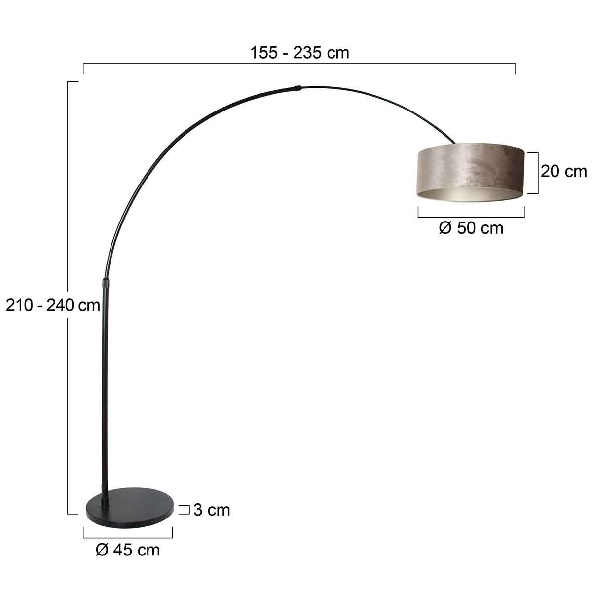 Grote Booglamp uit de Sparkled Light serie, wordt geleverd met zilveren velours kap met een doorsnede van 50 centimeter en 20 centimeter hoog. Het armatuur is vervaardigd uit geborsteld staal met een zwarte kleurtoon en voorzien van een E27 fitting, geschikt voor alle type lichtbronnen tot 60 watt. Door de verschillende verstel mogelijkheden kunt u precies licht geven daar waar u het wilt. De maximale hoogte van de lamp is 230 centimeter. De maximale uitschuiflengte is 190 centimeter (zonder kap). Wordt geleverd met snoer van 320 centimeter met vloerschakelaar. Bestel de 8128ZW vloerlamp nu online met de service en garantie bij lampbestellen.nl