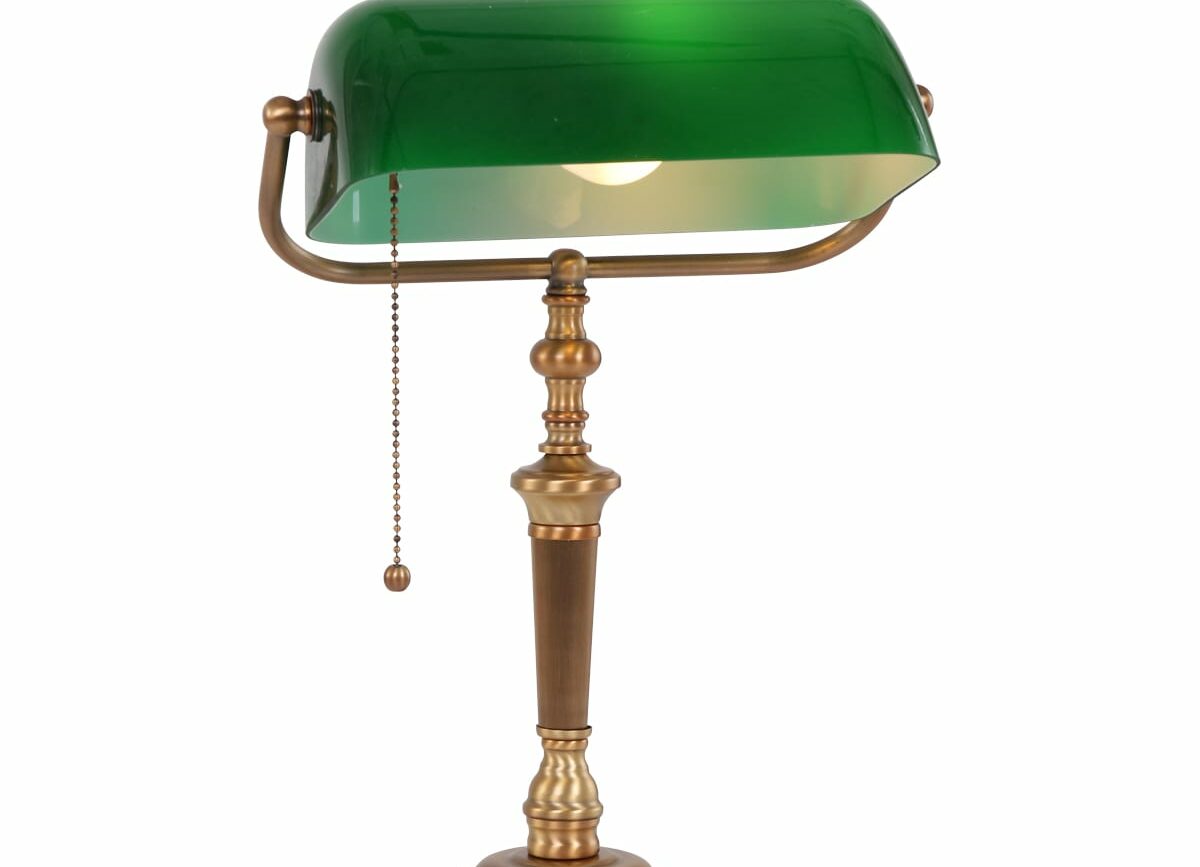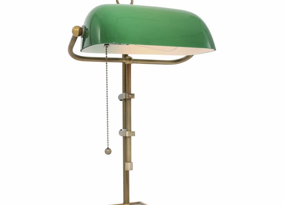 Deze mooie klassieke Bankiers / Notarislamp. Een tijdloos model die vervaardigd is uit bronskleurig metaal en groen glas. Het glas is kantelbaar. voorzien van een E27 fitting (maximaal 40 watt). Geschikt voor LED lampen. Bureaulamp is te bedienen door trekschakelaar. Bestel deze tafellamp / notarislamp nu online met de service en garantie van Aldor Verlichting.