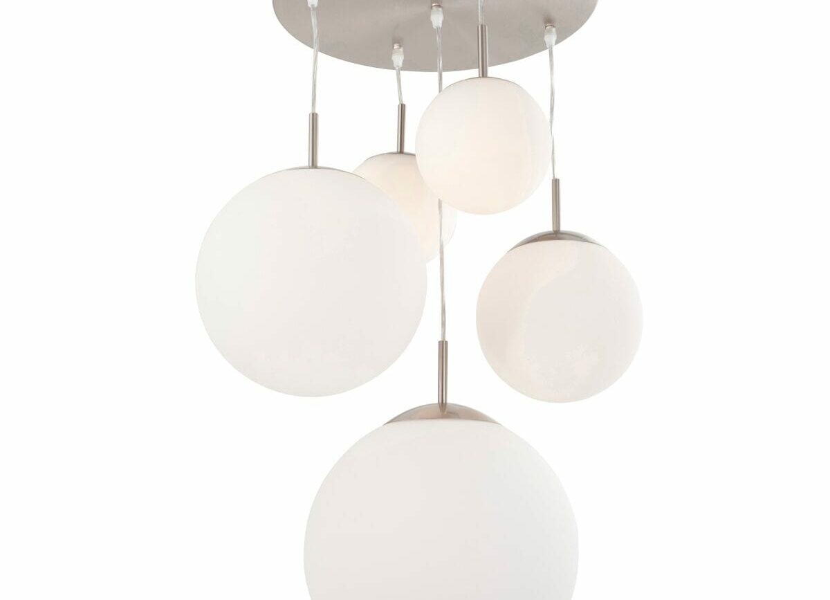 Deze Plafondlamp met 5 witte glazen bollen en metalen plafondplaat. 1x bol groot, 2x bol midden, 2x bol klein. Alle bollen voorzien van een E27 maat fitting maximaal 40 watt. Uit de serie Bollique. De kabels aan de bollen zijn uitschuifbaar tot 315 cm waardoor deze lamp ook zeer geschikt is als videlamp. Bestel deze plafondlamp nu online met de service en garantie van Aldor Verlichting.