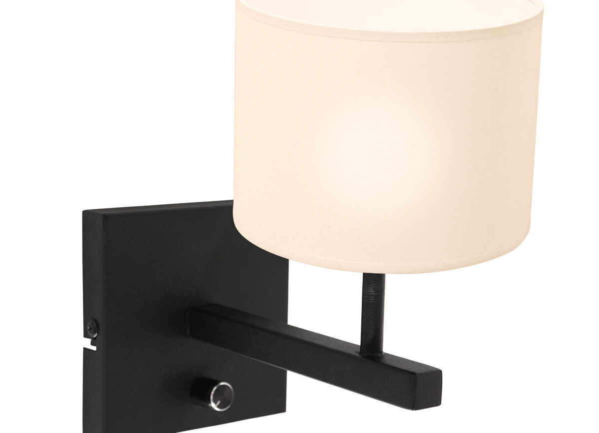 De Stang wandlamp is een stijlvolle metalen wandlamp met een zwarte coating en een witte chintz kap van 20 cm doorsnede en 12 cm hoog. De lamp heeft een E27 fitting voor lichtbronnen tot 40 Watt. Daarnaast beschikt de lamp over een apart leeslampje van 1 Watt met 2900 Kelvin en 100 Lumen, die afzonderlijk bediend kunnen worden met de twee aan/uit schakelaars op de wandplaat. De wandplaat is 11 cm hoog en breed, en de totale hoogte van de lamp is 27 cm. De lamp wordt direct aangesloten op het netwerk. Bestel de 7193ZW wandlamp online bij Lampbestellen.nl met uitstekende service en garantie.