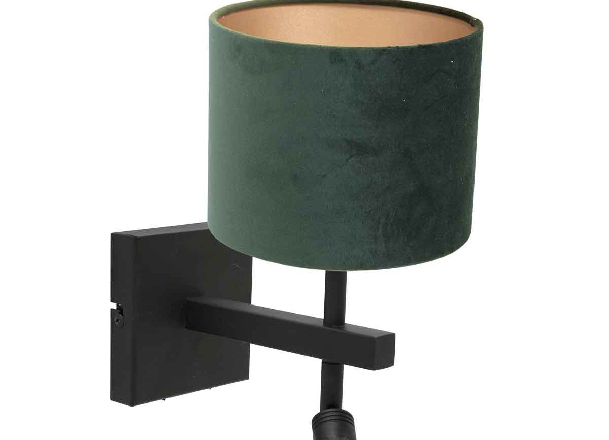 De Steinhauer Wandlamp Stang 8205ZW** is een stijlvolle wandlamp uit de Stang-serie met een matzwarte metalen armatuur en een luxueuze groene velours kap. De kap heeft een diameter van 20 cm en een hoogte van 15 cm. De lamp is voorzien van een E27-fitting en ondersteunt lichtbronnen tot 40 watt.