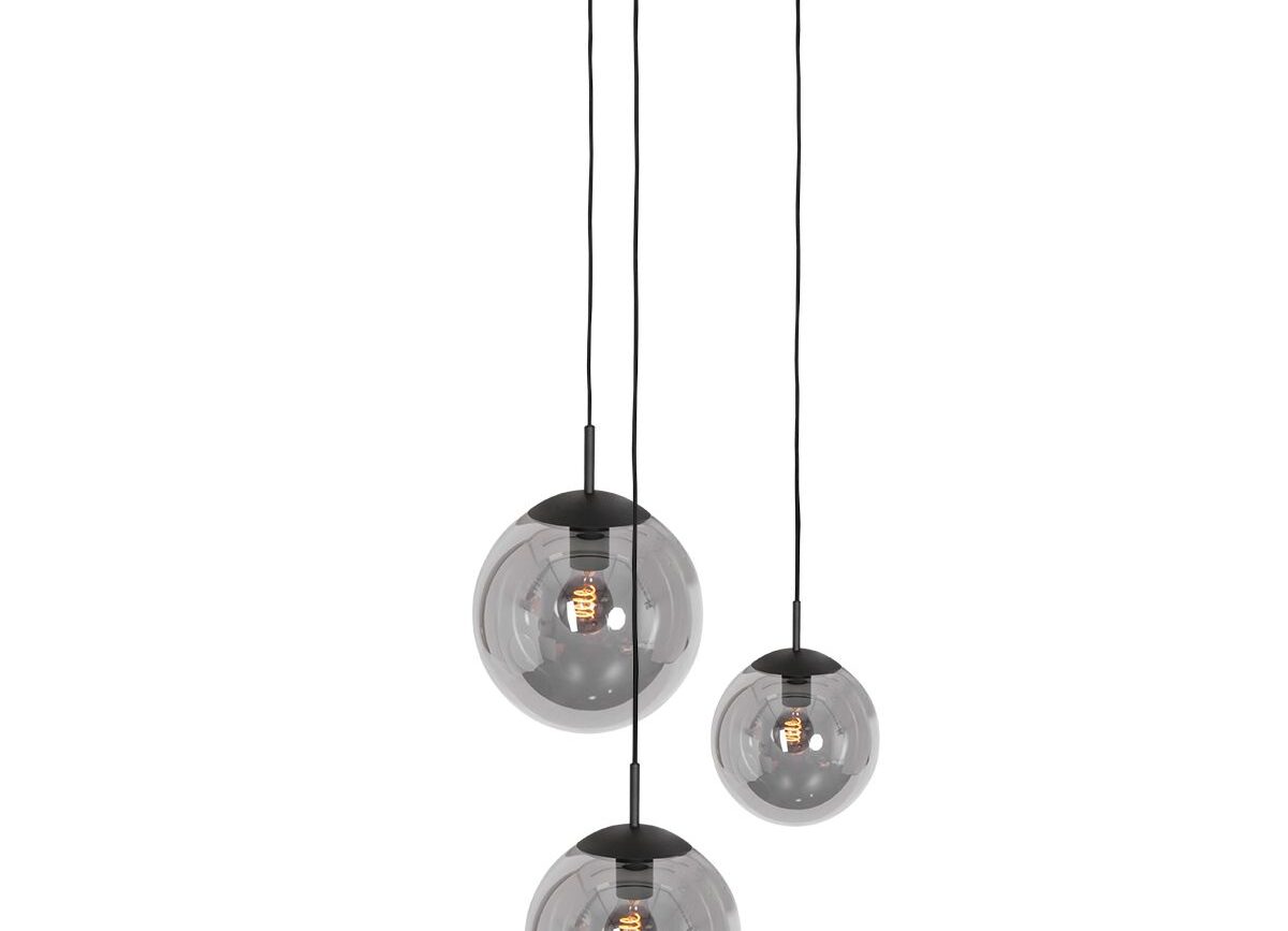 Voeg een vleugje artistiek toe aan uw interieur met de Zwarte Hanglamp Bollique 3123ZW. Deze hanglamp met drie lichten heeft rookkleurige glazen bollen die een subtiel spiegeleffect creëren. De bollen hebben drie verschillende afmetingen: 30 cm, 25 cm en 20 cm. De lamp is voorzien van een E27 fitting, waardoor u de hoogte van de bollen kunt aanpassen tussen 35 en 200 cm. Met een diameter van ongeveer 35 cm is deze lamp zeer divers in te zetten.