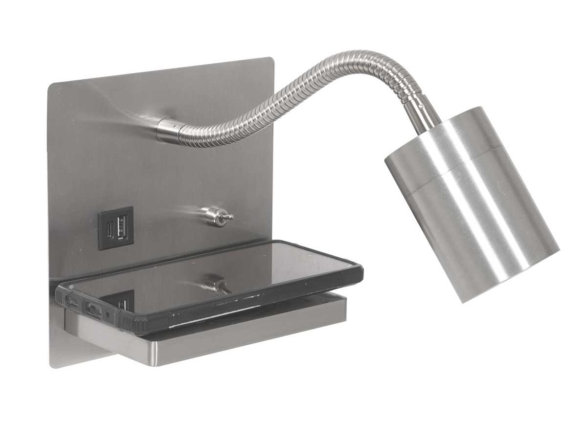 Ontdek de staalkleurige wandlamp met draadloze telefoonlader en USB-laders 3654ST uit de Upround serie. Deze wandlamp is ideaal als bedlamp, dankzij de goed richtbare veer waardoor het licht precies daar komt waar gewenst. Met de aan/uit-schakelaar op de wandplaat is de lamp eenvoudig te bedienen