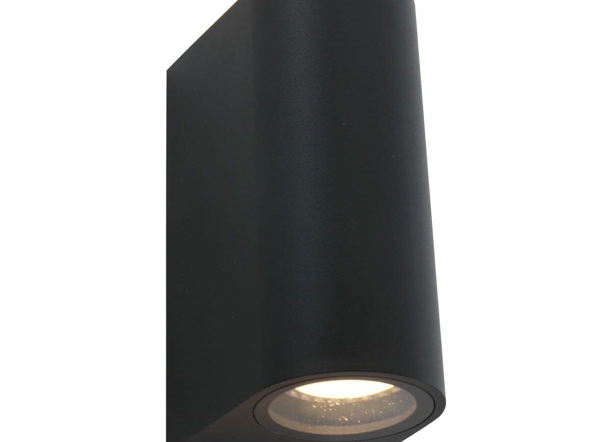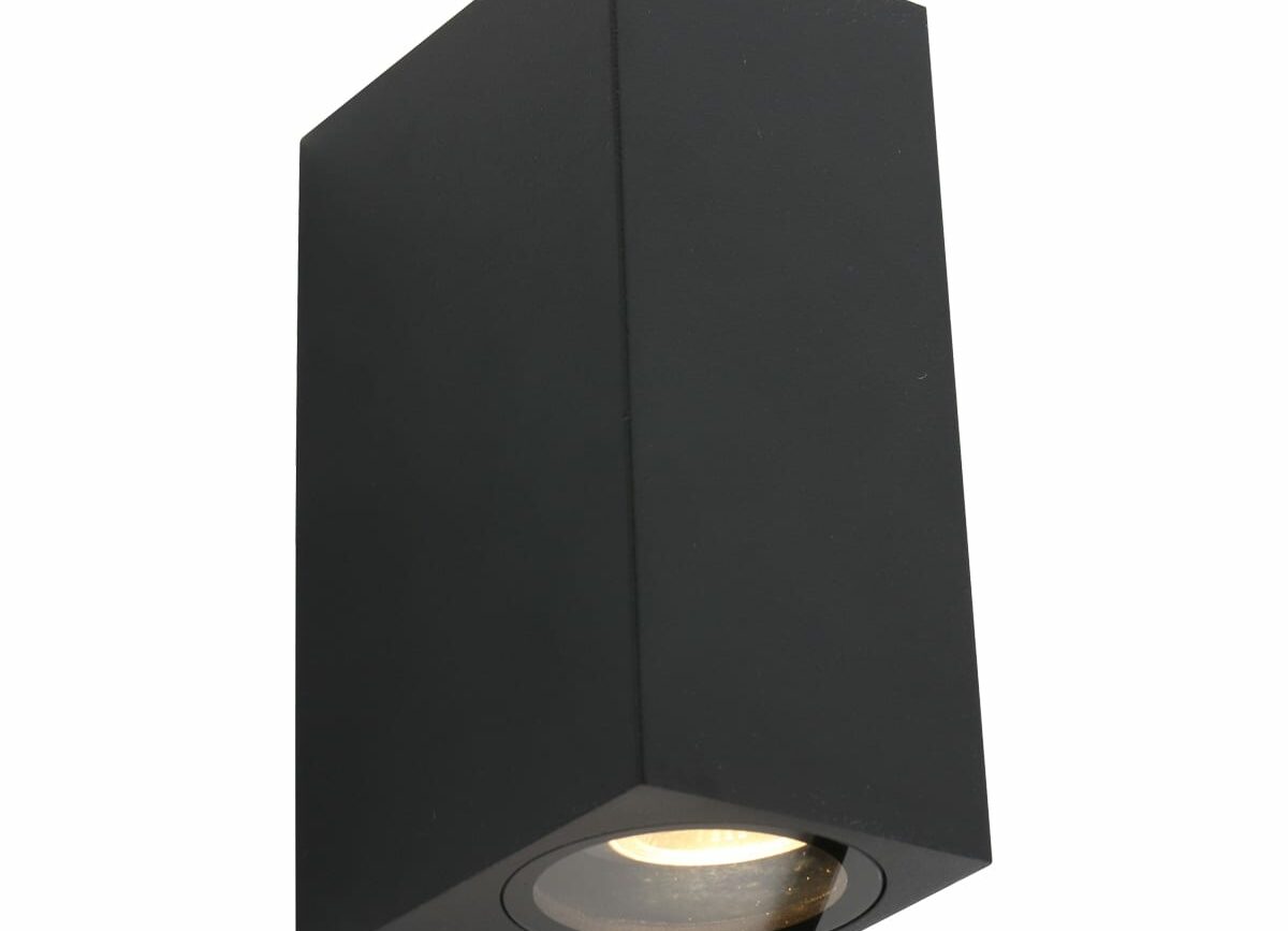 Deze 2 lichts buitenlamp met een zwarte moderne kleur geeft zowel van de onderkant, als de bovenkant licht. De behuizing is gemaakt van aluminium en afgewerkt met een glasplaat. De krachtige lichtstraal verlicht het huis en tuin op een efficiënte manier. De zwarte lamp wordt inclusief 2 GU10 (345 Lumen, 2700 Kelvin) lichtbronnen geleverd. De compacte muurlamp heeft een diepte van 9 cm en is 15 cm hoog. Deze buitenlamp beschikt over een IP54 waarde. Dit betekent dat hij spatwaterdicht en stofvrij is. Bestel deze buitenlamp nu online met de service en garantie van lampbestellen.nl 1497ZW