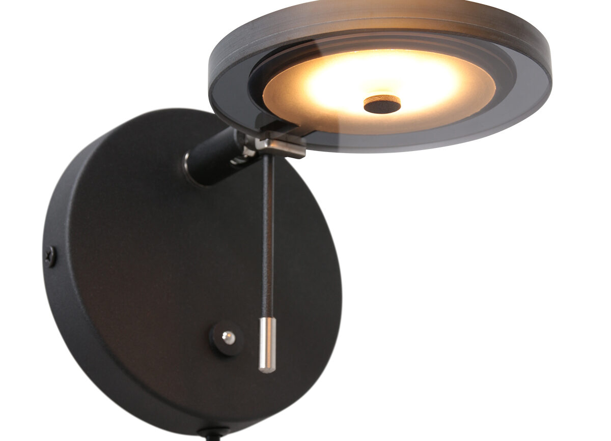 Moderne zwarte wandlamp uit de Turound serie met rookglas als reflector. De wandlamp is voorzien van een vervangbare LED module van 10 Watt met 1000 Lumen. Tevens is de lamp lichtkleur instelbaar tussen de 2200 en 4000 Kelvin. De lamp is te bedienen middels een push dimmer op de wandplaat. Kort indrukken staat voor aan/uit, lang indrukken staat voor dimmen van de lamp.